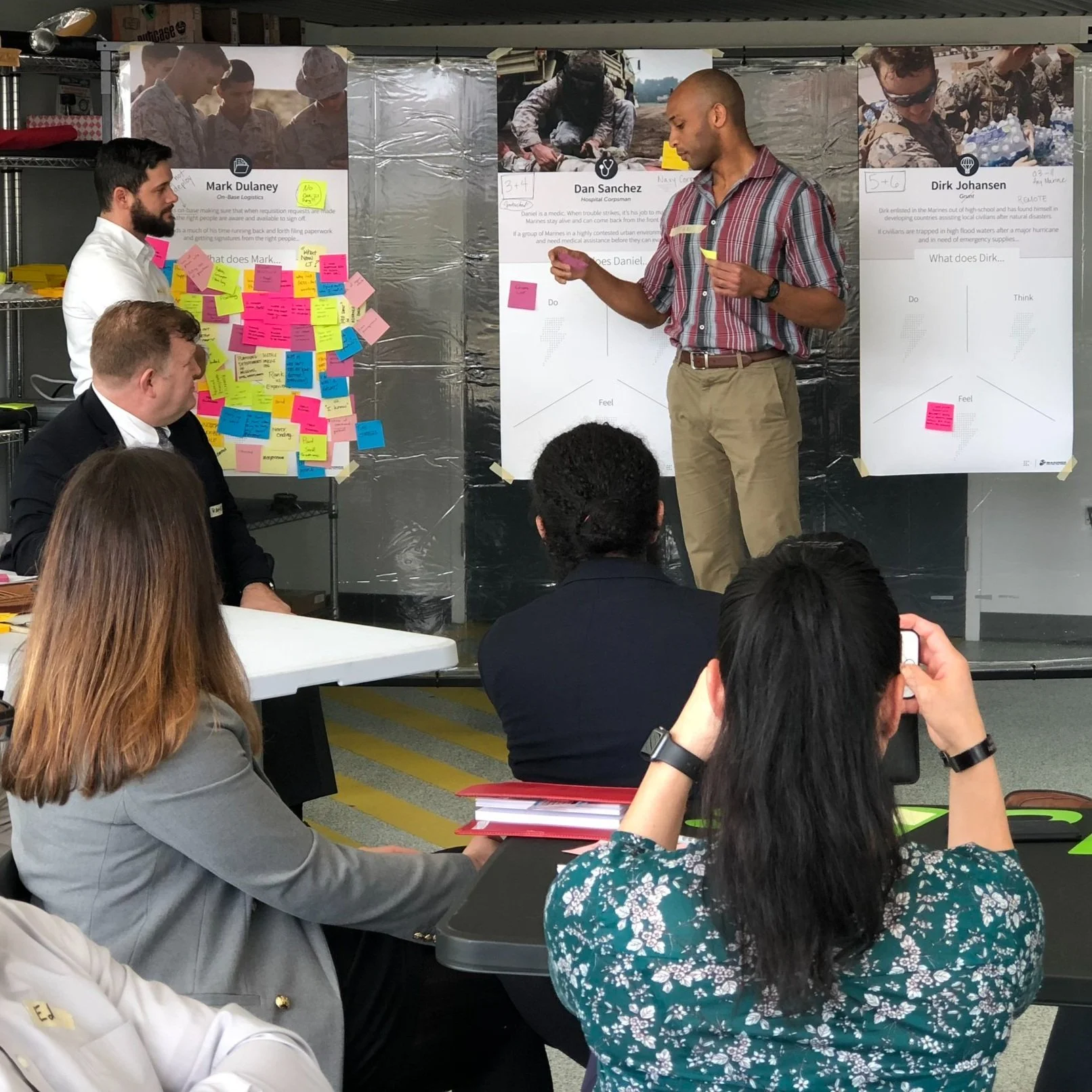 We then hosted an innovation workshop, with both officers and enlisted Marines to help build out the specific personas and brainstorm on several solution categories followed by some hands-on making to see if any trends appeared in their ideation.